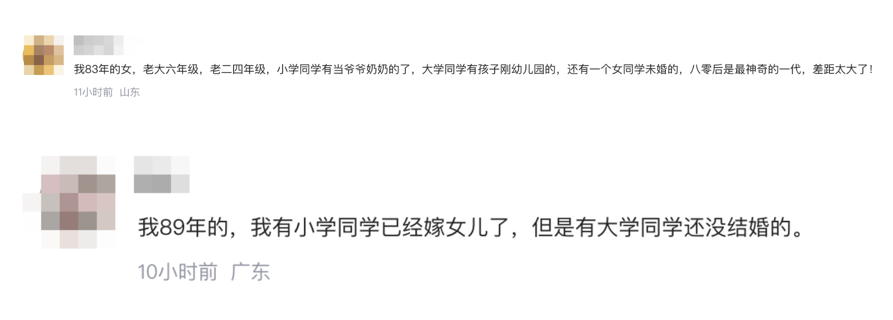 更有网友感慨80后人生节奏差距之大:“我83年女,老大六年级,老二四年级。小学同学有当爷爷奶奶的,大学同学有小孩刚幼儿园的,还有一个同学未婚的。80后是最神奇的一代,差距太大了!”