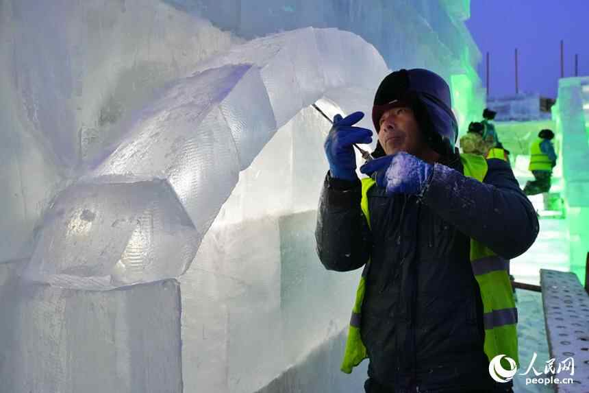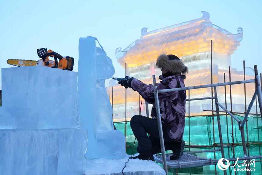 工人正在园区内雕刻冰雕。人民网记者 李洋摄