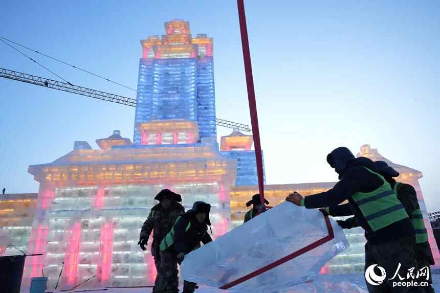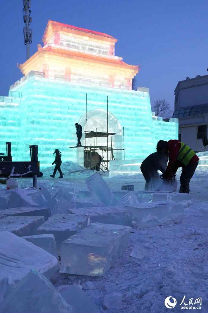 工人正在对冰建外立面进行打磨。人民网记者 李洋摄