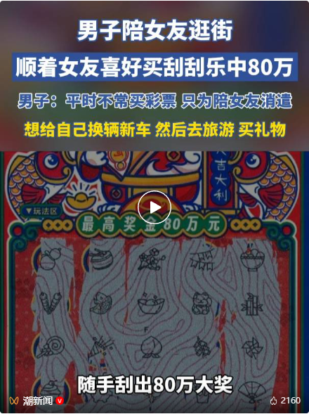 陪女朋友逛街时,随手刮出80万大奖是种怎样的体验?这不,陕西渭南小伙王先生(化名)“宠女友”刮来意外之喜!