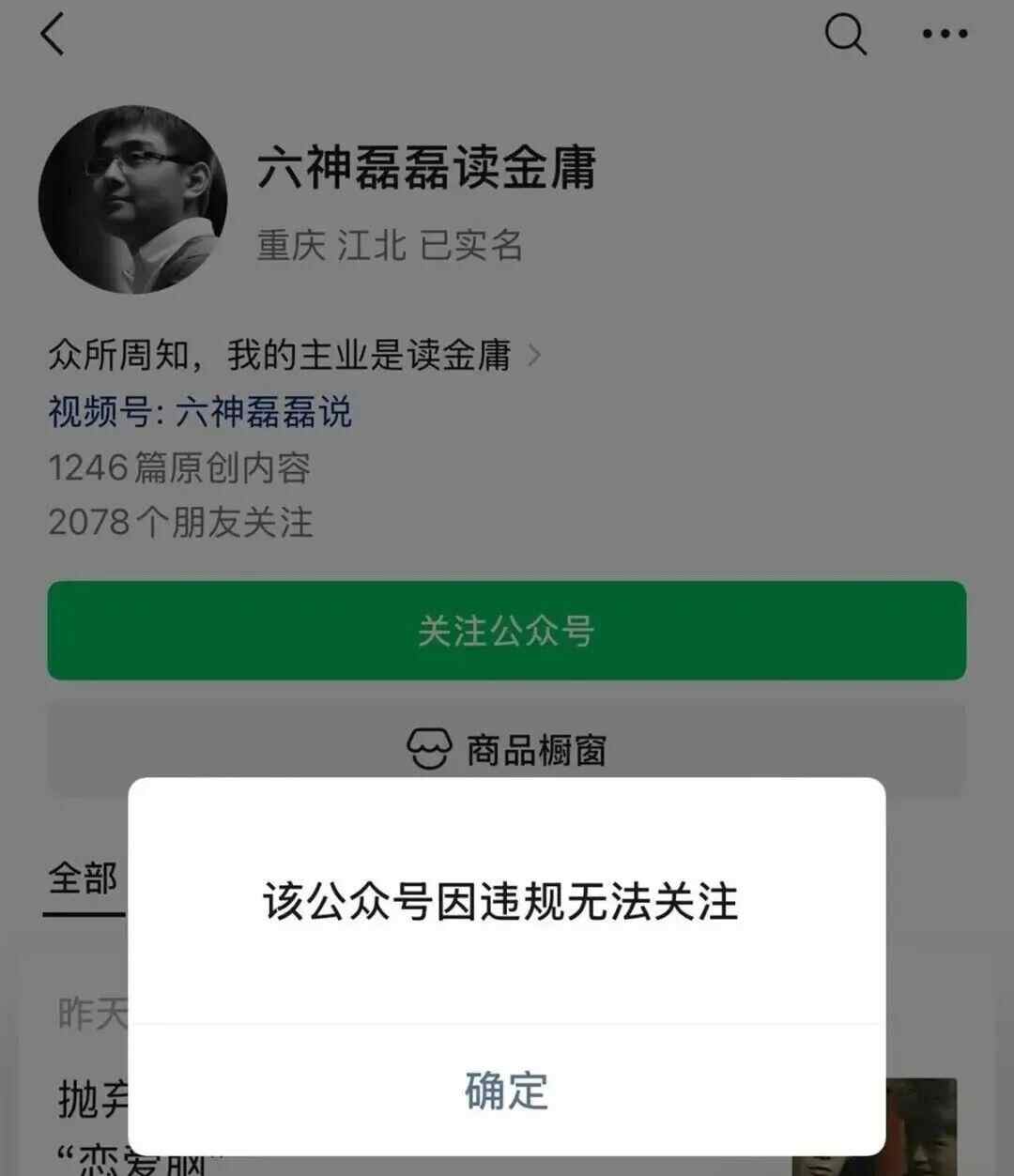 12月14日中午,记者注意到,粉丝众多的微信公众号“六神磊磊读金庸”因违规无法关注。已关注该号的网友,可以正常打开他的往期大部分文章;未关注该号的网友,无法通过搜索关注。