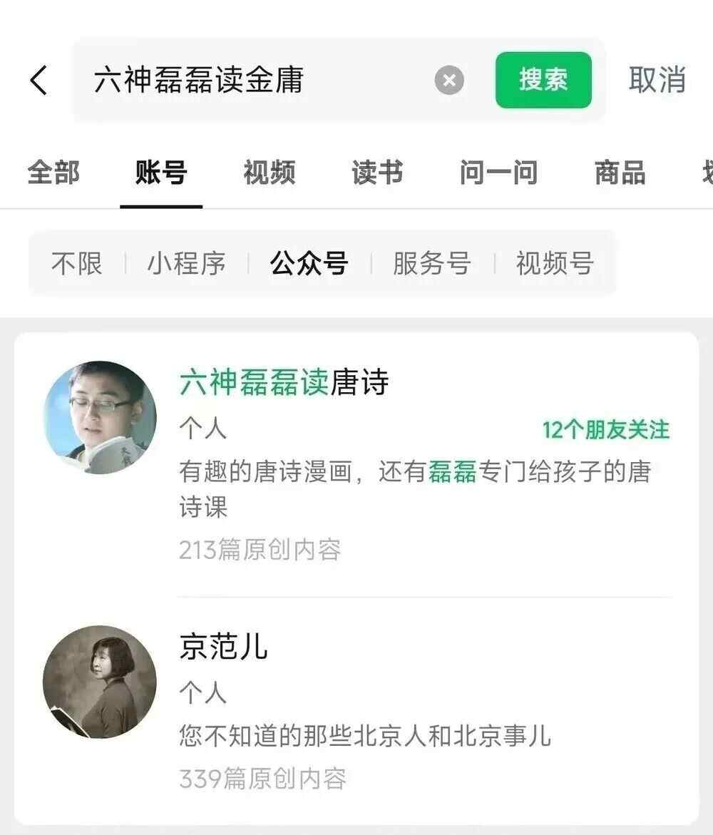 14日下午,记者注意到,未关注该账号者已无法通过搜索功能找到“六神磊磊读金庸”的微信公号。