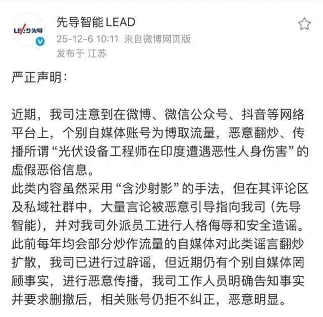 先导智能12月6日发布严正声明称,个别自媒体账号为博取流量,恶意翻炒、传播所谓“光伏设备工程师在印度遭遇恶性人身伤害”的虚假恶俗信息。