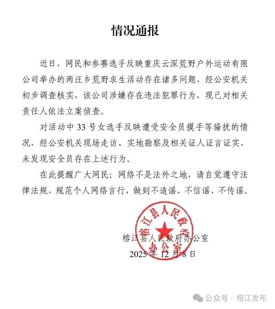 重庆云深荒野户外运动有限公司于12月2日在榕江县两汪乡主办的荒野求生活动,因近期低温天气、森林火险等级较高等因素影响,为确保全体参与人员的人身安全,已于12月6日终止。我们非常关注广大网友反映企业在举办活动过程中存在不公平、安全和服务保障不到位、企业聘请的安全员有骚扰女性参赛人员等问题,我们正督促重庆云深公司马上退回参赛选手报名费用,并督促企业妥善处置后续相关工作。请广大网友放心,榕江县一定会妥善处置好这个事情,不推诿扯皮、不推卸责任,依法依规严肃追查相关责任。