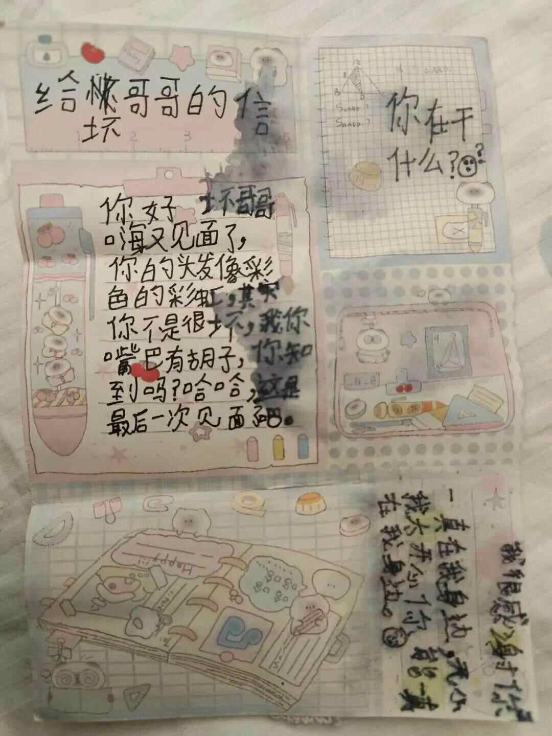 第一次见仪仪,她说我像坏人,头发像彩虹,是坏哥哥。昨晚仪仪给我写的信太让我感动了,她让我睡觉前再打开(她说我不是坏哥哥)。八岁的小女孩很多字不会写,我在掌心教她。我说我们还会回来找你玩。”