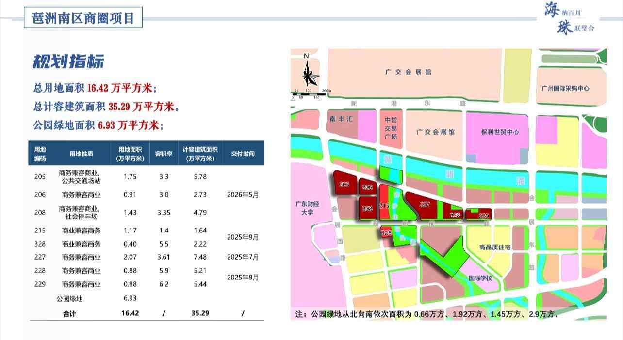 上述地块性质均为商务兼容商业,涵盖了商业、酒店、办公等产业类型。根据公告内容,海珠区期望将琶洲南区商圈打造成为集多元功能与生态美学于一体的开放式商业街区。以高端商业为核心驱动,规划商业裙楼,引入国内外知名品牌旗舰店、轻奢集合店及特色主题商业,构建高端消费场景;布局高端商务空间,建设智能化商务写字楼,满足企业总部办公、商务洽谈等需求,形成高端商务集群。