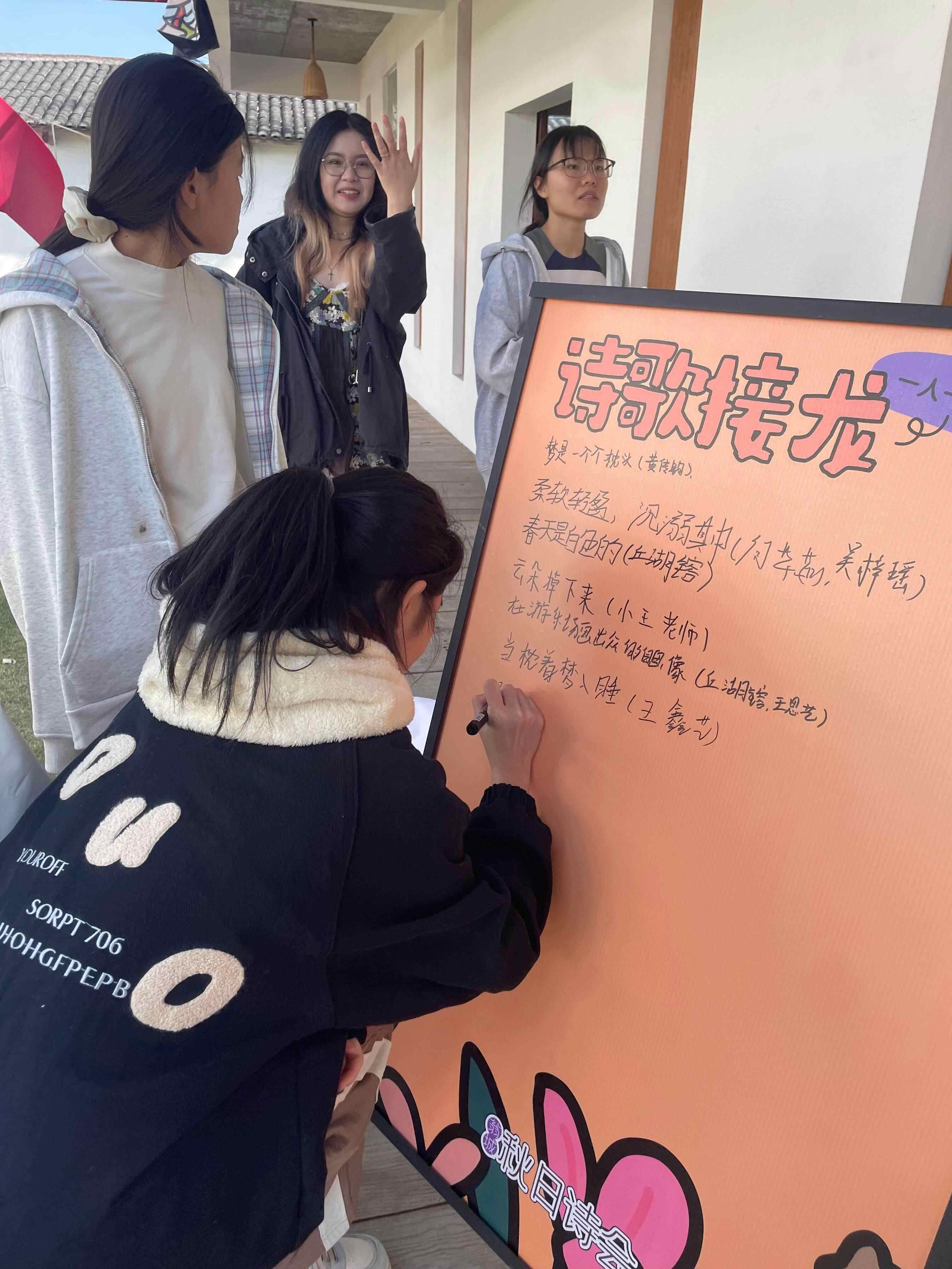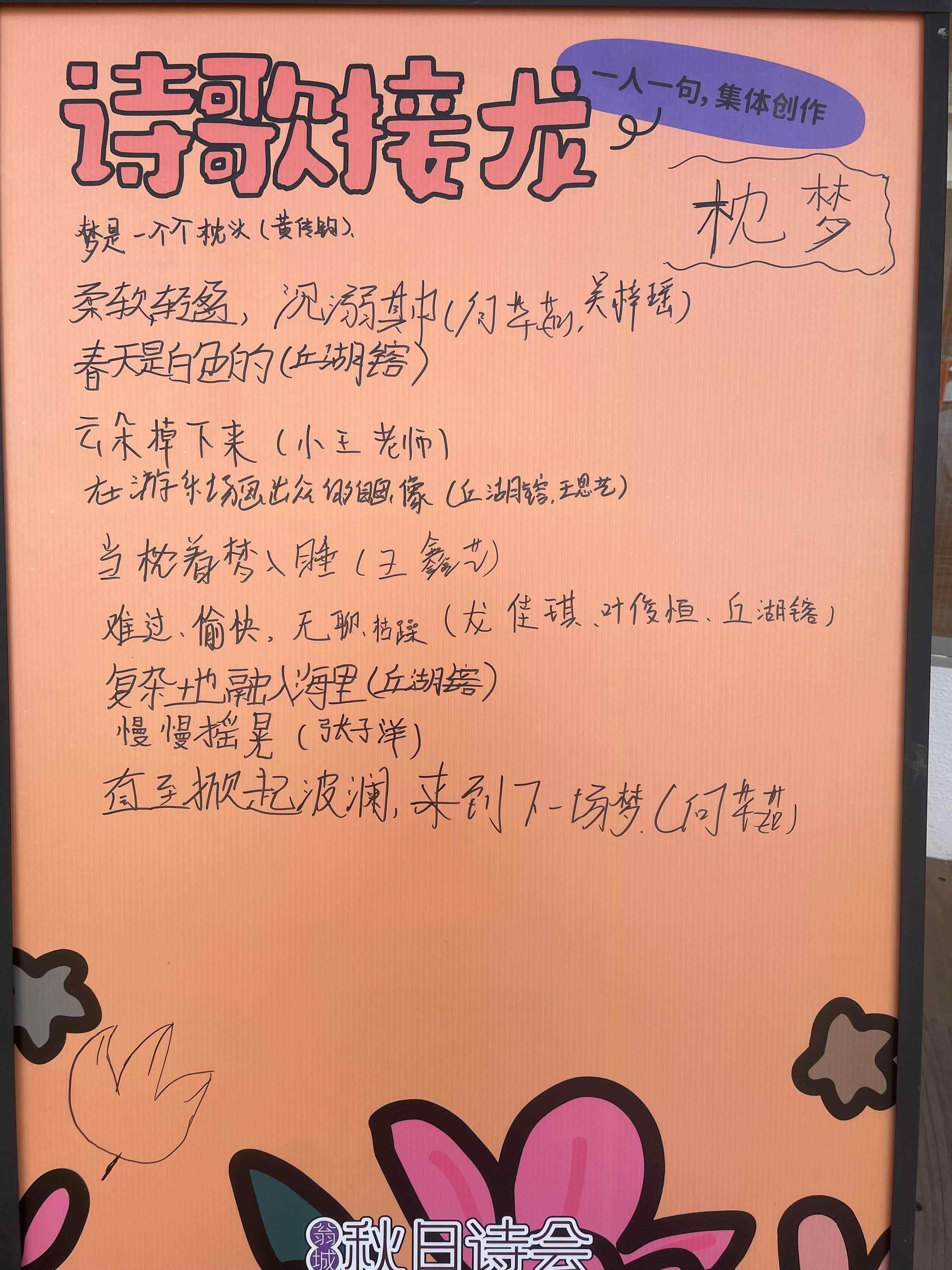 诗会的高潮是诗歌接龙创作。在羊城晚报艺术研究院诗歌教育负责人小王老师的引导下,大家你一言我一语,共同即兴完成了一首属于这个秋日的集体诗作《枕梦》。诗中,“梦是一个个枕头”开启序曲,“春天是白色的”与“云朵掉下来”交织出童真视角,而“当枕着梦入睡”则巧妙点题。最终,在意象“慢慢摇晃”之后,诗句以“直至掀起波澜,来到了下一场梦”作结,将秋日之景、枕上之思与共创之乐完美融合,成为一份生动的集体记忆。