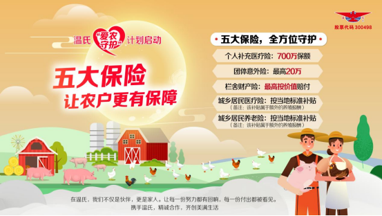 正是瞄准这一需求,2024年底,温氏启动“爱农守护”计划,为合作农户统一购买量身定制的保险,涵盖人身与栏舍两方面——医疗险(按当地标准补贴)、养老险(按当地标准补贴)、意外险、补充医疗险(700万元保额)、栏舍财产险。