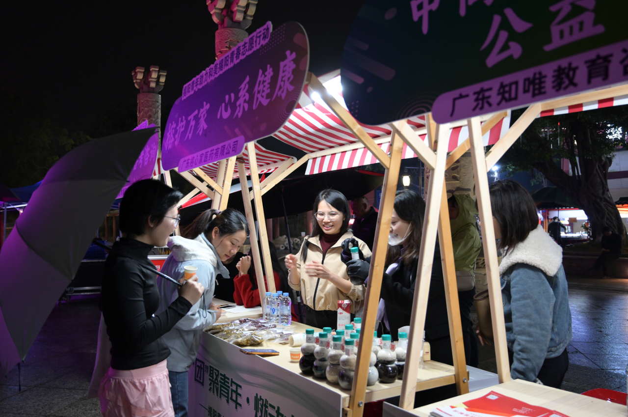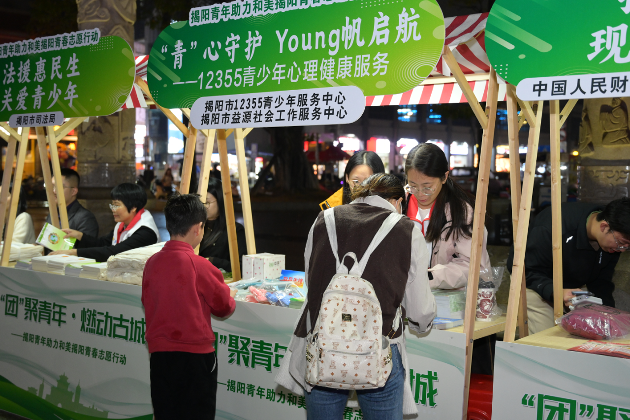 在揭阳,志愿服务工艺集市在全市五地同期开展。集市设置了12355青少年心理健康服务等摊位,还组织搭建了全市兴乡青年进行展示的平台,集中呈现全市青年创业成果,展现出揭阳青年投身家乡建设的责任担当。此外,活动设置便民服务区,吸引众多群众驻足。其中,政策宣传区围绕金融支持、人才扶持、反诈防骗等热点内容,通过发放宣传资料、现场答疑等方式,让居民群众更了解相关政策。
