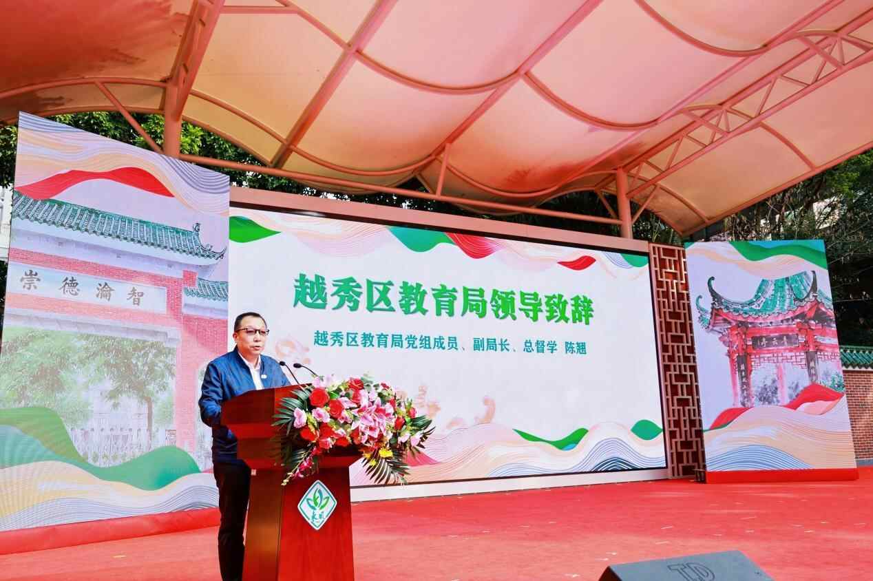 越秀区教育局党组成员、副局长、总督学陈翘高度肯定了学校四十年来扎根教育沃土、深耕育人事业的丰硕成果,更寄语学校以四十周年校庆为新起点,坚守教育初心,勇担育人使命,持续推动学校发展迈向新高度,努力成为越秀教育的新名片。