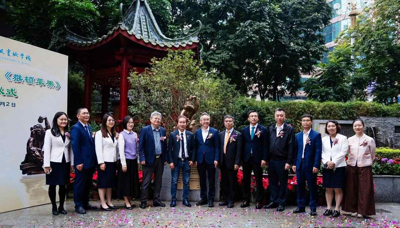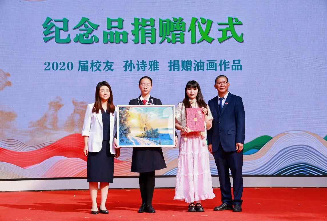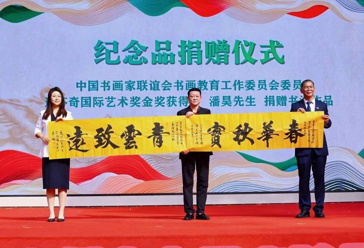 温情与感动之外,大会的各项环节也持续传递着校友情、师生情与家国志。在纪念品捐赠环节,校友与社会各界纷纷向学校捐赠著述、画作、墨宝等珍贵礼物。广东美术馆副馆长胡锐韬代表馆方,捐赠周波艺术家复刻画作《勤学图》。广东省人大教科文卫委员会主任委员、广东人文艺术研究会会长刘小毅委托广府文化宣传大使伍燕代为捐赠书法作品。中国书画家联谊会书画教育工作委员会委员、达芬奇国际艺术奖金奖获得者潘昊现场捐赠书法作品。校友方面,老校友慷慨捐赠我国著名雕塑大师、广州雕塑院院长许鸿飞先生创作的《猴顿苹果》雕塑。此外,中共广东省委教育工委原书记、广东省教育厅原厅长罗伟其教授向学校赠送著述《教海探索一一基于策略与实践的思考》,广东省教育研究院原党委书记、院长汤贞敏研究员向学校赠送著述《教育的理想状态一一对教育高质量发展的追寻》。