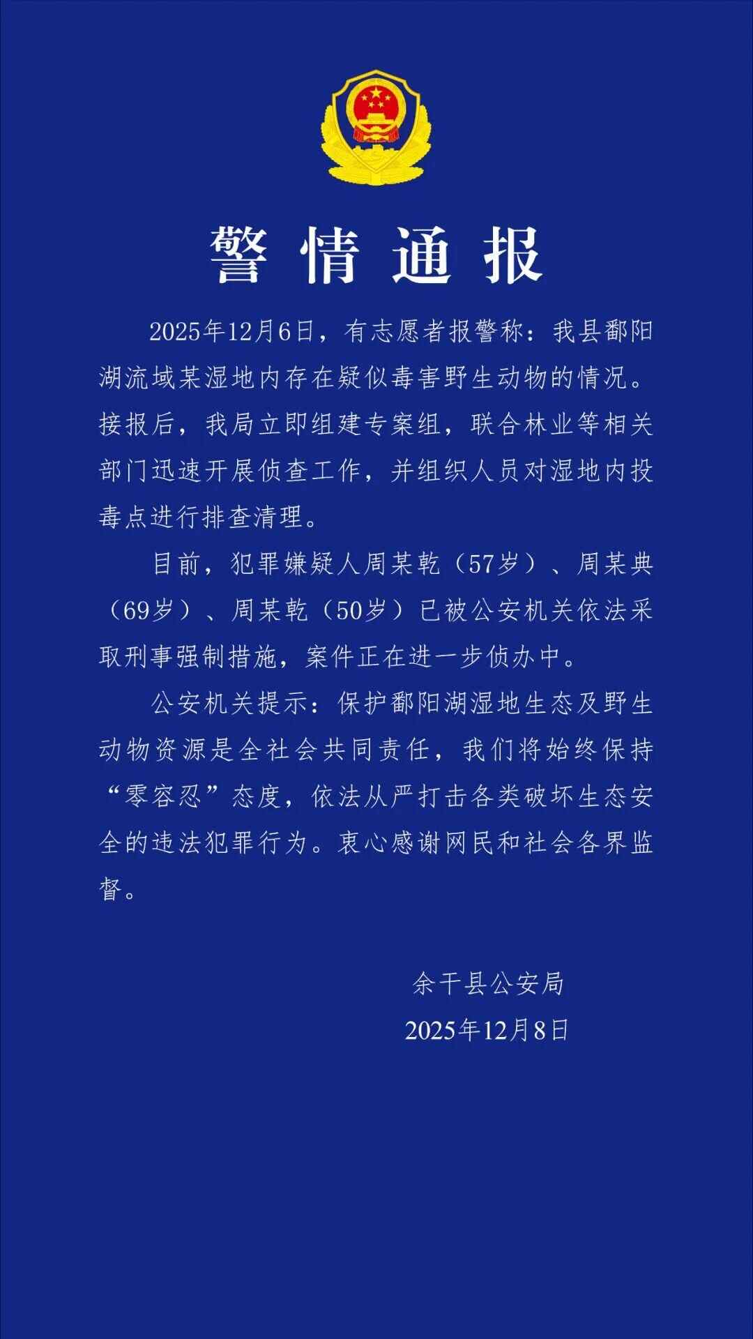 12月8日,余干县公安发布警情通报,犯罪嫌疑人周某乾(57岁)、周某典(69岁)、周某乾(50岁)已被公安机关依法采取刑事强制措施,案件正在进一步侦办中。