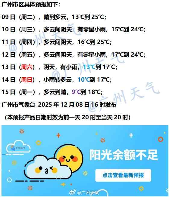 广州方面,明天太阳还继续值班,周三起云量逐渐增多,还偶有零星小雨,家人们抓紧时间洗晒,毕竟周末还有新阿冷要来,15日广州最低气温甚至只有9℃。