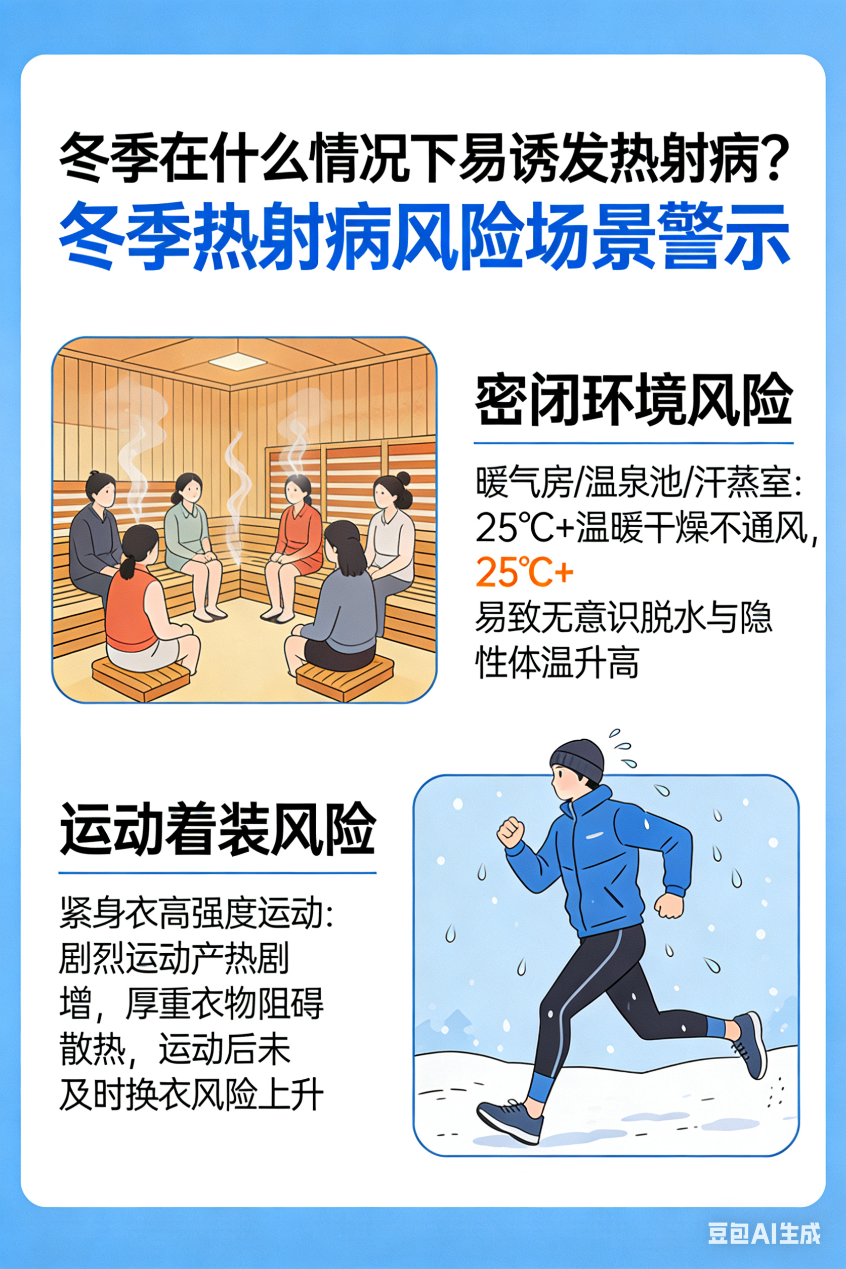 热射病的本质是身体产生的热量,远远超过了它能散发的热量,导致热量在体内蓄积,与季节无绝对关系。冬天虽然室外环境温度低,但在一些特殊情况下,人体的产热和散热平衡同样会被打破,尤其是当“散热”这个关键环节出现严重障碍时。