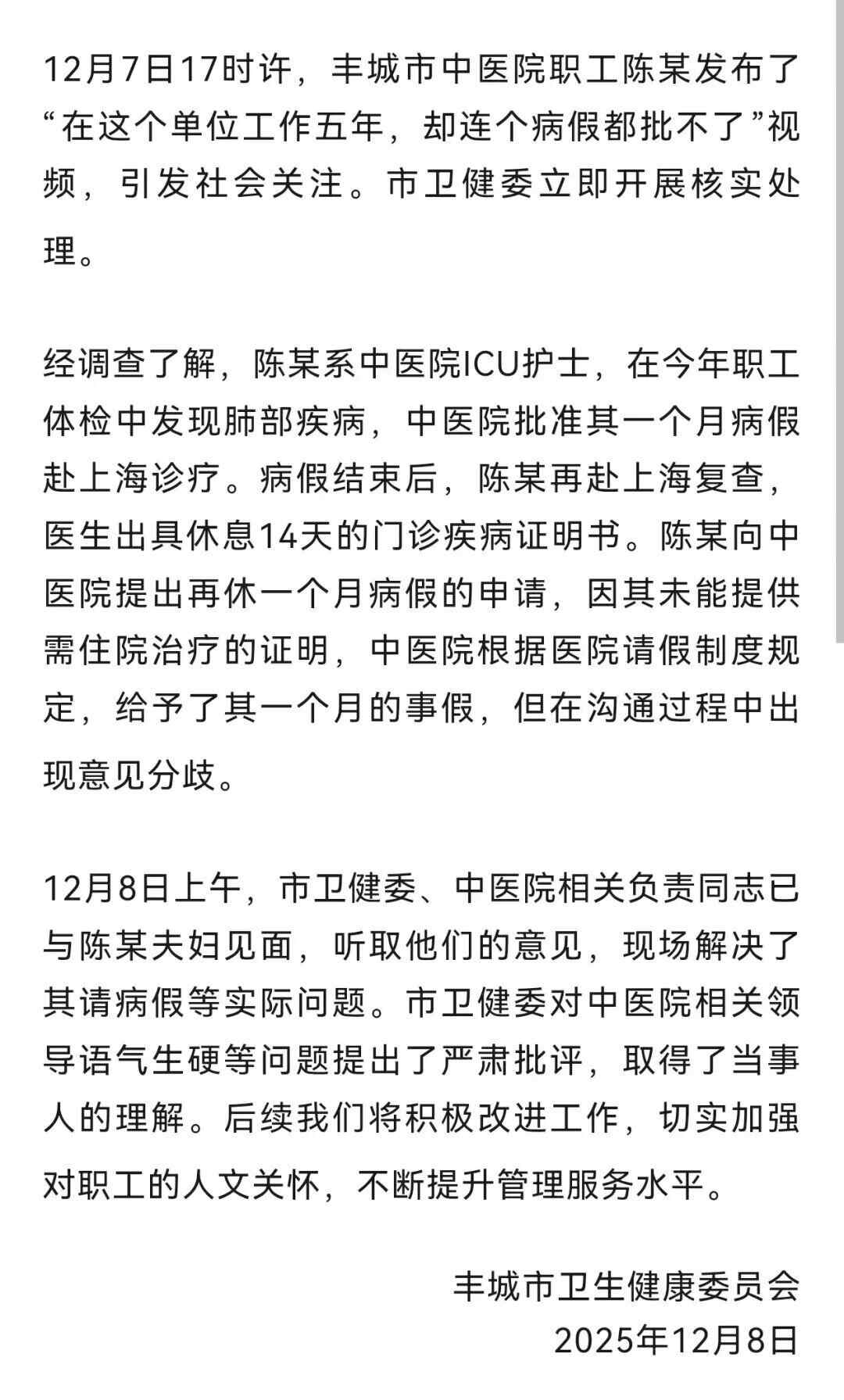 12月7日17时许,丰城市中医院职工陈某发布了“在这个单位工作五年,却连个病假都批不了”视频,引发社会关注。市卫健委立即开展核实处理。