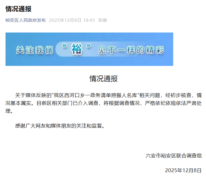 8日晚,六安市裕安区联合调查组发布情况通报称,关于媒体反映的“我区西河口乡一政务清单照搬人名库”相关问题,经初步核查,情况基本属实。目前区相关部门已介入调查,将根据调查情况,严格依纪依规依法严肃处理。