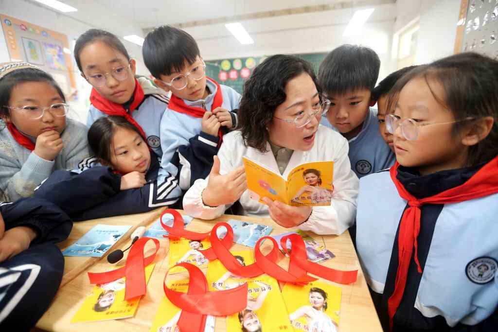 12月1日,江苏省连云港市连云区一所小学的校医给学生讲解防艾常识。