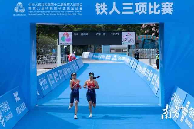 11月27日,肇庆砚阳湖畔,全国第十二届残疾人运动会暨第九届特殊奥林匹克运动会(以下简称“残特奥会”)铁人三项赛场,全盲运动员杨晓婷在引导员谭嘉怡的牵引下,踉跄冲线,完成750米游泳、20公里自行车、5公里跑步的高强度赛程。