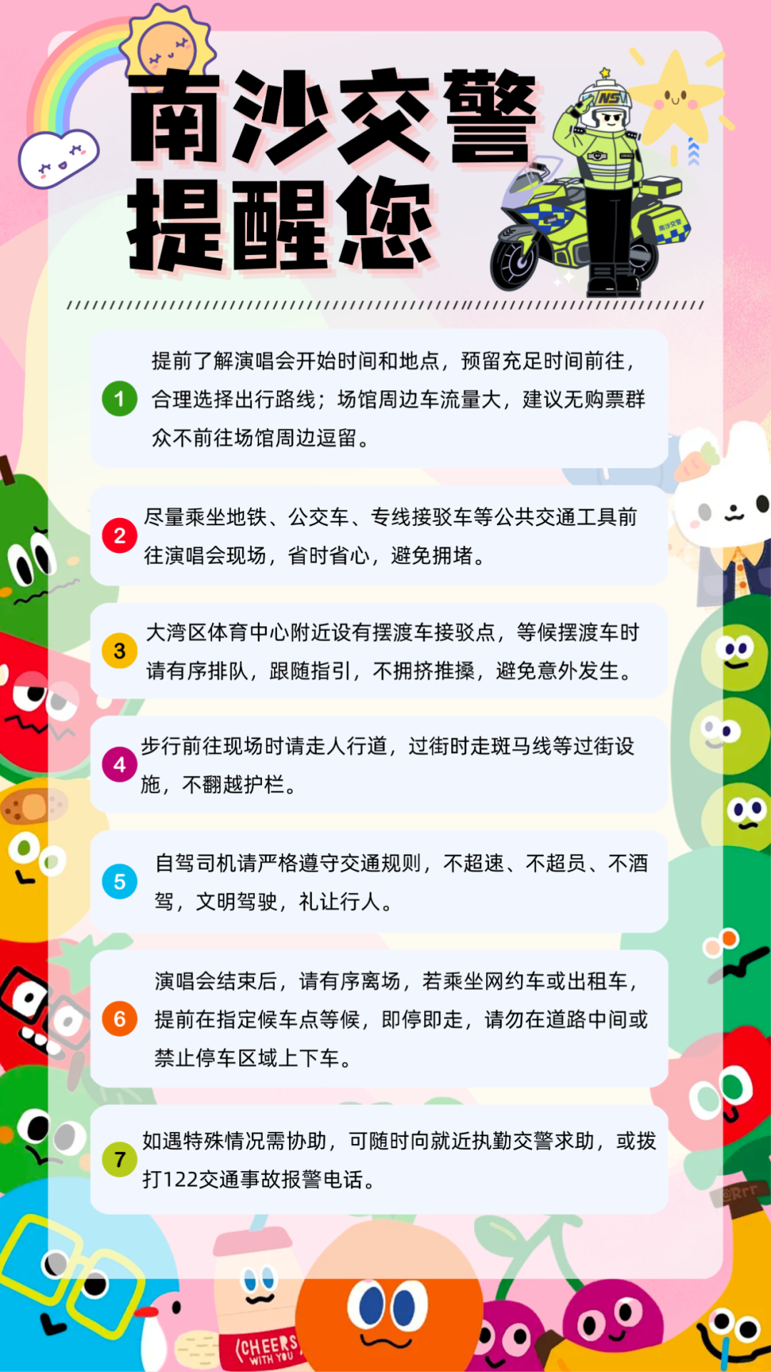 关于散场安排,需乘坐地铁的观众可从北验票口经北六门行至新港大道,搭乘接驳公交返回万顷沙地铁站。据悉,演出日当天,地铁18号线万顷沙站的运营服务时间将延长至23:30。乘坐接驳大巴散场的观众,请根据目的地选择上车点。
