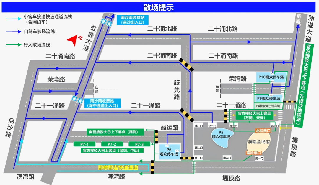 散场自驾的观众请按停车位置选择离场路线。在P9、P10停车场停车的观众,从北验票口经北六门取车后,可经新港大道驶离。在P5停车场停车的观众,从南验票口离场,取车后经跃先路、二十涌南路转虹霞大道驶离。