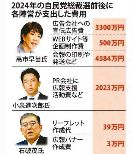 根据高市早苗所属政治资金管理团体“新时代政策研究会”的收支报告书,2024年该团体获得约2亿日元政治资金,其中8384万日元被用于选前及选举期间的宣传费用。而根据石破茂的政治资金管理团体“石破茂政经恳话会”及其政党支部的收支报告,在2024年总裁选举中获胜的石破茂,明确记为用于总裁选举的支出仅有“宣传册制作费”39万日元和“网络宣传横幅制作费”3万日元等,远低于高市早苗。