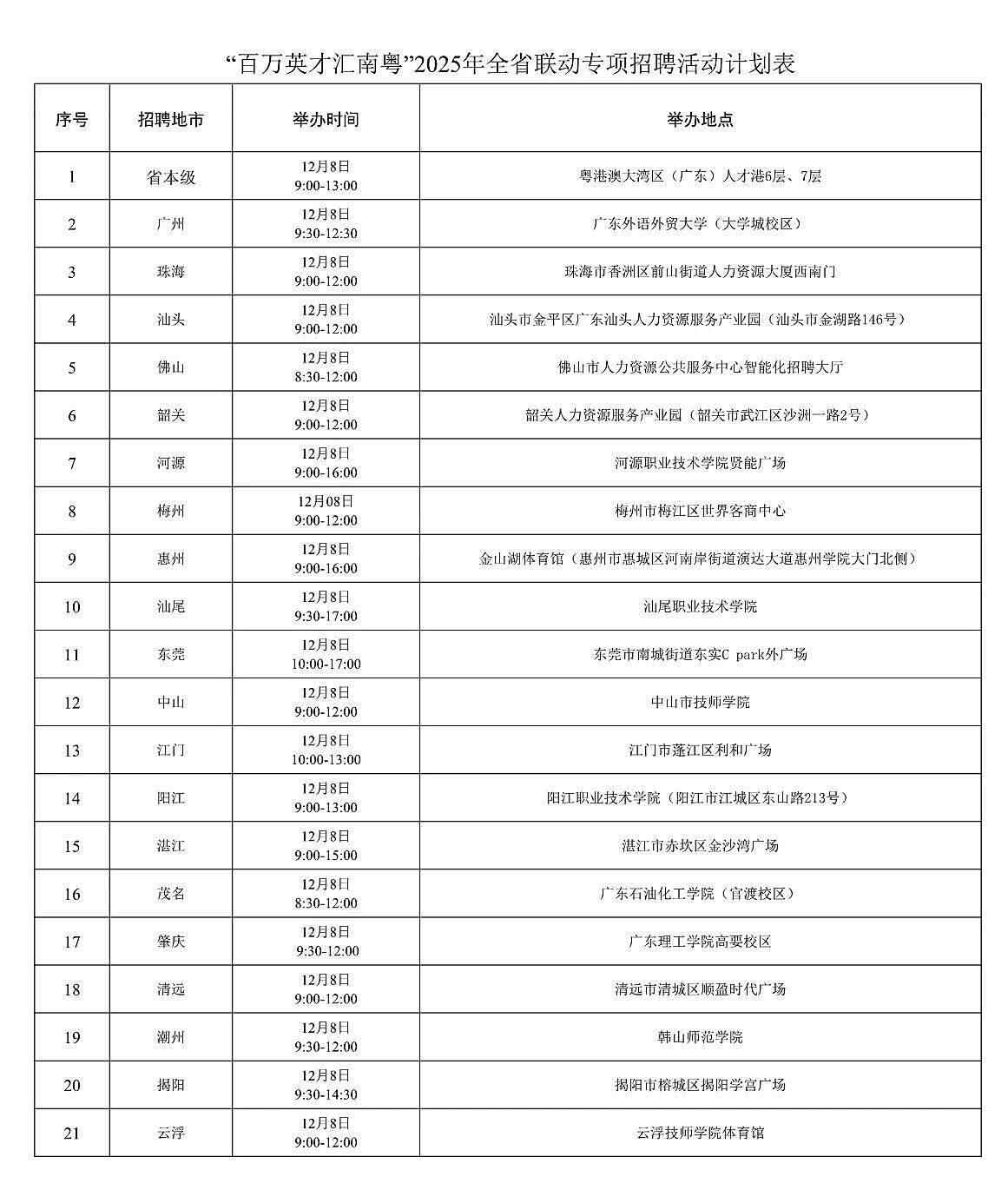 根据“百万英才汇南粤”行动计划统一部署,聚焦年底求职关键阶段,广东将于12月8日启动“百万英才汇南粤”2025年全省联动专项招聘活动,省本级和全省20个地市将同步举办专项招聘,以“全省联动、优岗云集”的强劲势能,向全国高校毕业生发出年末“逐梦南粤”的诚意邀约。