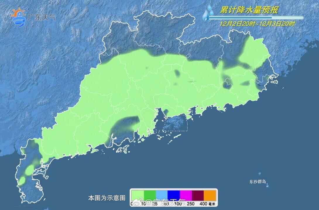 12月3日,南部市县阴天到多云,有分散零星小雨,其余市县多云为主,局部有零星小雨。最低气温:粤北的北部市县9℃~13℃,南部沿海市县18℃~20℃,其余市县14℃~17℃。