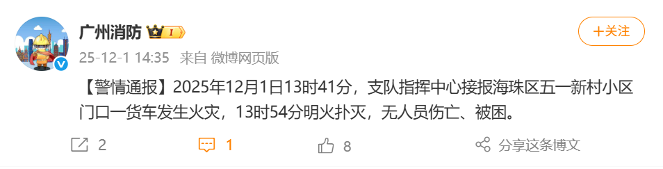 根据广州市消防部门通报,2025年12月1日13时41分,支队指挥中心接报海珠区五一新村小区门口一货车发生火灾,13时54分明火扑灭,无人员伤亡、被困。