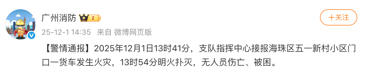 据广州消防通报,2025年12月1日13时41分,支队指挥中心接报海珠区五一新村小区门口一货车发生火灾。消防力量迅速处置,于13时54分将明火扑灭,事故无人员伤亡、被困。