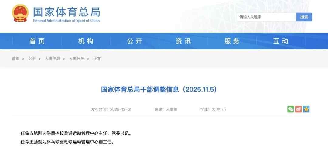 12月1日,国家体育总局任命占旭刚为举重摔跤柔道运动管理中心主任、党委书记。任命王励勤为乒乓球羽毛球运动管理中心副主任。