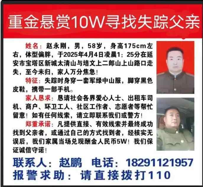 目前,赵鹏还在社交媒体扩散着寻找父亲的寻人启事,并悬赏10万元。凡提供直接、有效线索并最终成功找到父亲者,或通过自己的方式找到者,经核实无误后,家属当场兑现酬金10万元。