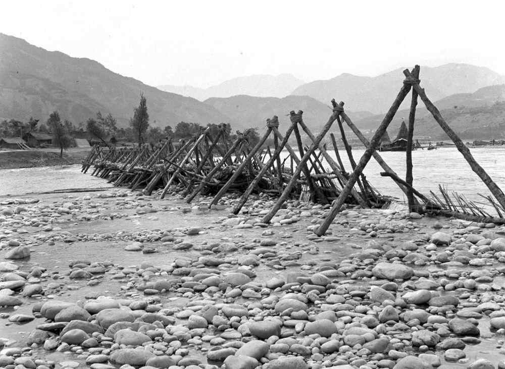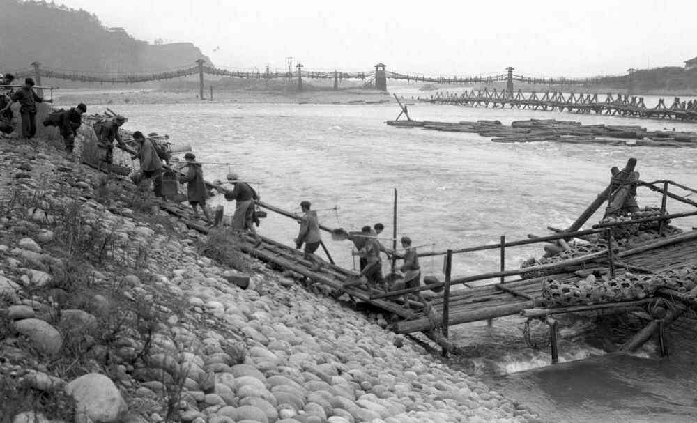 四川灌县都江堰的截流工程——杩槎,用它可以将水挡住,以免从外江流入内江(1958年5月整理)。新华社记者 吴化学 摄