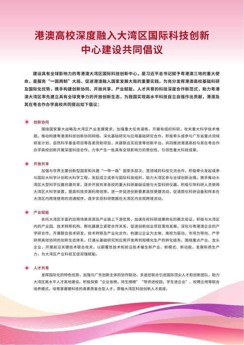 香港大学、香港中文大学、香港科技大学、香港理工大学、香港城市大学、香港浸会大学、香港中文大学(深圳)、香港科技大学(广州)、香港城市大学(东莞)、北师香港浸会大学、澳门大学、澳门科技大学共同发起《倡议》,助力粤港澳大湾区率先建成具有全球竞争力的开放创新生态。