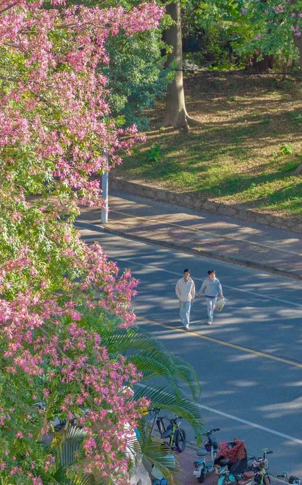 初冬的广州,堪称“浪漫主场”。华南师范大学校园内“花王”白异木棉飘雪湖面,粉色花廊载满青春记忆,让人不禁回想起那些年少美好。
