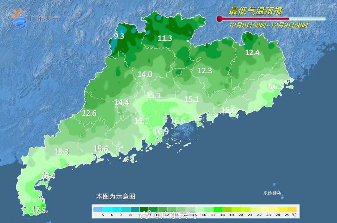 今天(8日),广东南部市县多云间晴天,其余市县晴到多云;西部和北部市县早晚有轻雾或雾。最低气温:粤北市县9~12℃,粤西和珠江三角洲南部市县15~18℃,其余市县12~15℃。