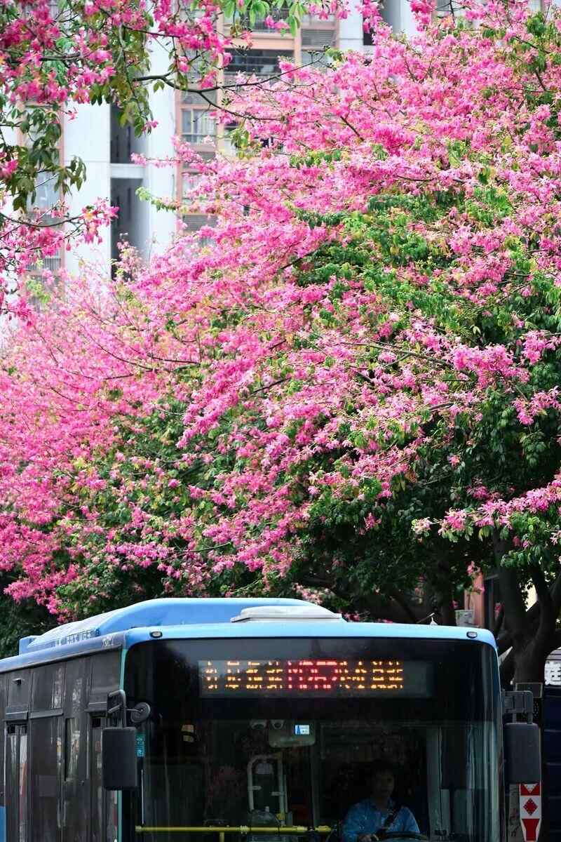 深圳市光明区星湖路变身“花隧道”,公交车穿行其中,恍如误入漫画场景。