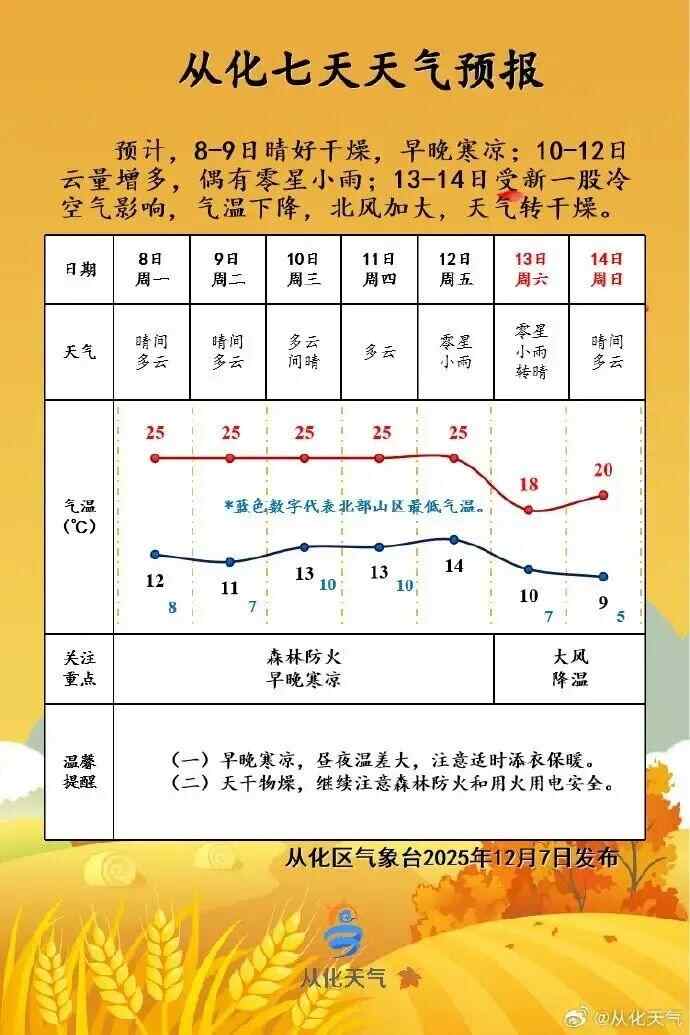 广州市从化区气象台12月7日傍晚全区七天预报。图/新浪微博@从化天气