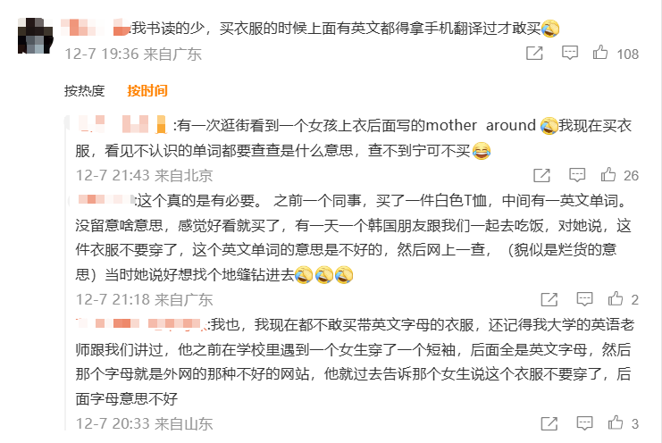 对此,有网友表示自己买带有英文的衣服的时候,都得拿手机翻译过才敢买。还有网友回复称自己都不敢买带英文字母的衣服,听说过身边人因为穿了带有不认识且意思不好的英文的衣服而闹出糗事的经历。
