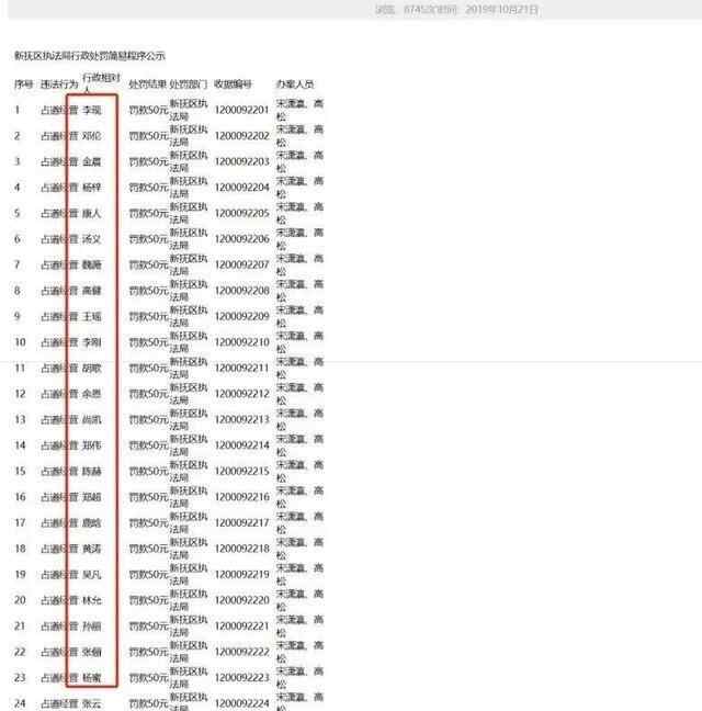 据现代快报,12月4日,有网友发现辽宁抚顺新抚区住建局于2019年10月21日公示的一占道经营处罚名单疑存猫腻,名单上的名字不但均为“姓氏+单名”的两字结构,而且还不少与知名艺人重名,如鹿晗、孙俪、李现、邓伦、金晨、董璇、杨颖等。