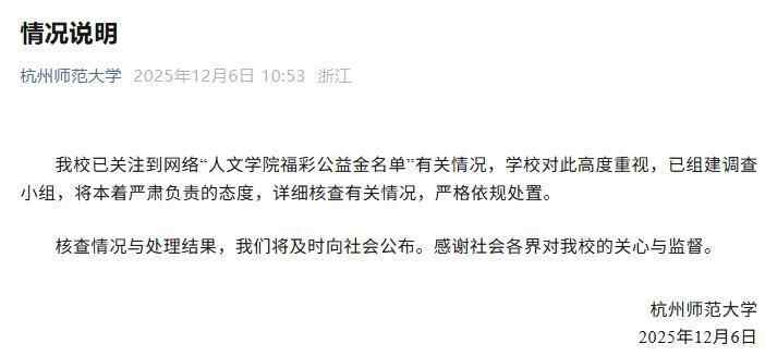 我校已关注到网络“人文学院福彩公益金名单”有关情况,学校对此高度重视,已组建调查小组,将本着严肃负责的态度,详细核查有关情况,严格依规处置。