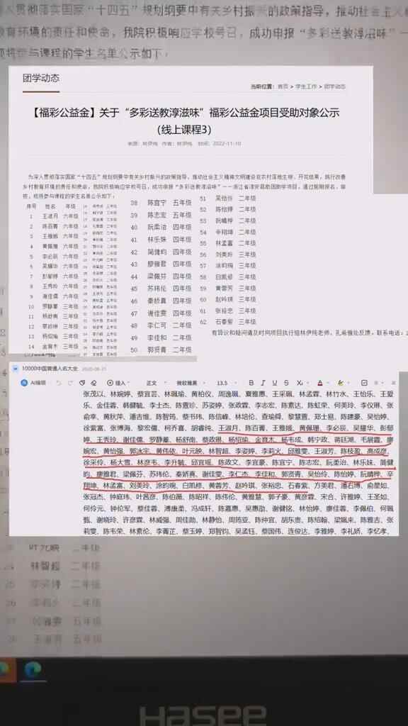 该网友发布视频称,其发现杭州师范大学人文学院官网2022年11月公示的一份“福彩公益金项目受助对象”名单中,所使用的姓名来自2020年发布的百度文库10000个人名大全,姓名和顺序一模一样。该网友还发现,该学院官网公示的其他“福彩公益金项目受助对象”名单中,也存在大量使用上述人名大全名录中姓名的情况。质疑存在作假的问题。