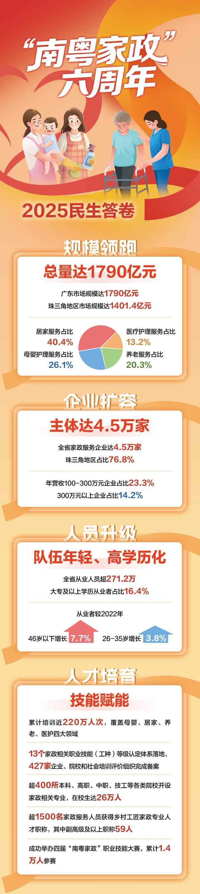 民生无小事,枝叶总关情。今年是“南粤家政”工程实施六周年,这项深植南粤大地的民生工程,早已成为串联就业与民生的暖心纽带。自2019年启动实施以来,截至2024年底,广东家政服务市场规模突破1790亿元,较2019年增长3.2倍,全国市场份额从4.8%跃升至14.6%;家政企业超4.5万家,从业人员达271万人,分别实现1.7倍和2.1倍的大幅增长。
