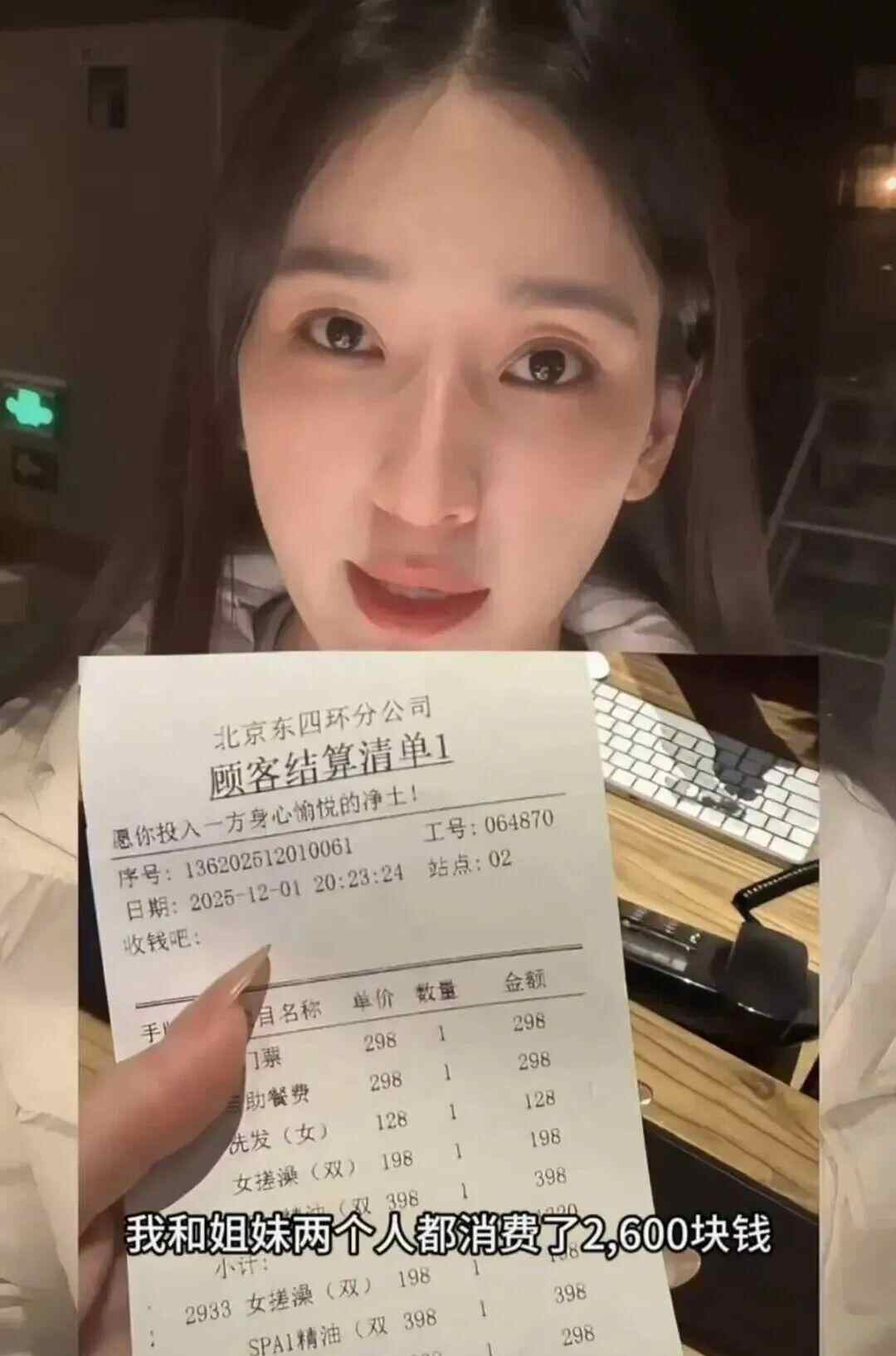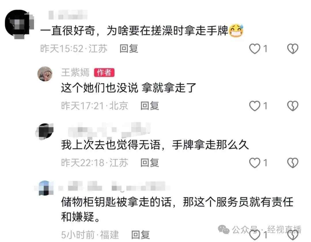 “中途我在里面搓澡、洗头发用了一个小时的时间,在这个过程当中,我的眼睛是被服务员全程用眼罩蒙住的,我的手牌是被他们拿走的,不在她的视线范围内。”王紫嫣说。至于中途服务员为何要拿手牌,她在评论区回复,这个她们也没说,就拿走了。对此,有网友也称“上次去也觉得很无语,手牌拿走那么久”。