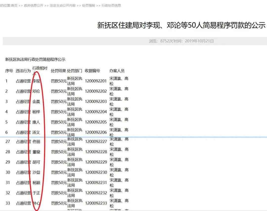 12月4日,有网友发现辽宁抚顺新抚区住建局于2019年10月21日公示的一占道经营处罚名单疑存猫腻,其上的名字不但均为“姓氏+单名”的两字结构,而且还不少与知名艺人重名,如李现、邓伦、金晨、董璇、杨颖等。
