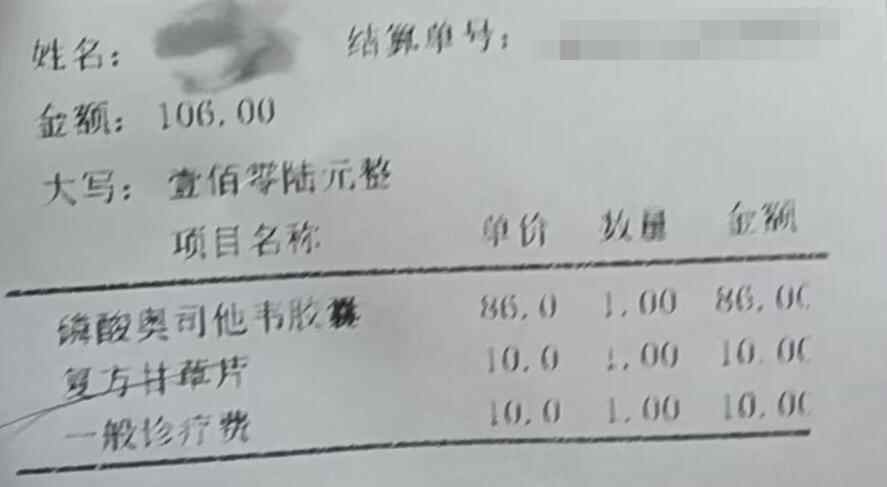 重庆一名高三女生的父亲向记者介绍,12月3日上午,女儿来到重庆市酉阳县车田乡卫生院治疗,医生检查后给她开了两种药,一种是磷酸奥司他韦胶囊,价格是86元,另一种是复方甘草片,价格是10元,加上诊疗费,共计106元,最终医疗报销后实际支付44.56元。