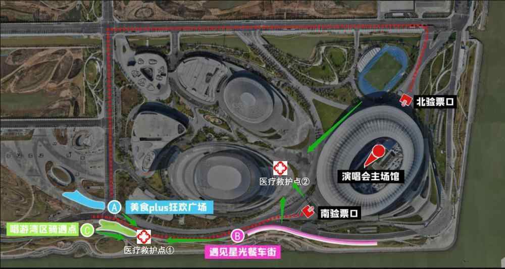 场馆入口根据座位区域进行划分。持有内场门票的观众可由内场A、B通道进入,看台观众则需从看台南、北入口进场。