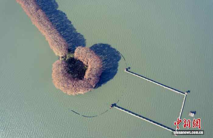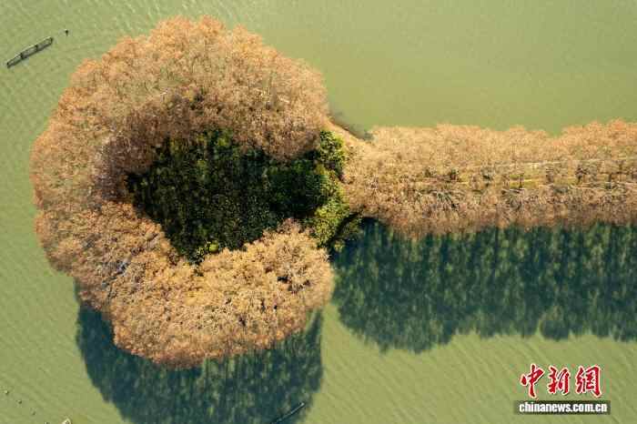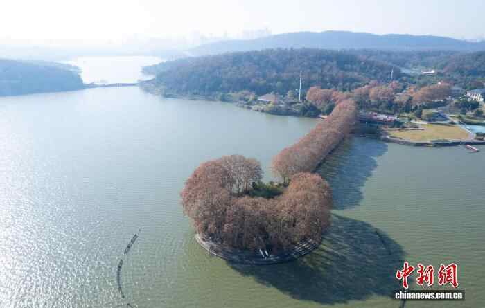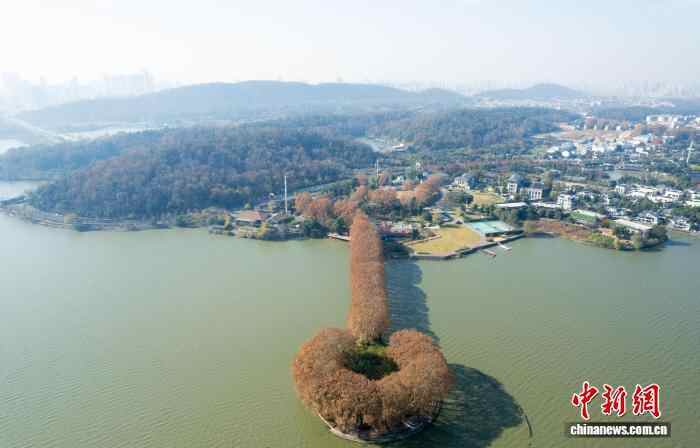 12月3日,航拍武汉东湖绿道团山驿站旁,湖中半岛的湖心步道上,梧桐树叶色彩斑斓。从空中俯瞰,其如同一个金灿灿的“汤勺”,伸入一湖碧波中。(无人机图片)中新社记者 张畅 摄