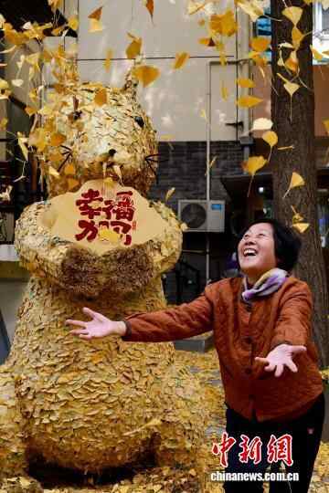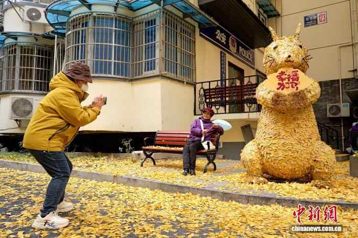 12月3日,市民与“银杏松鼠”小品合影。中新社记者 钱晨菲 摄