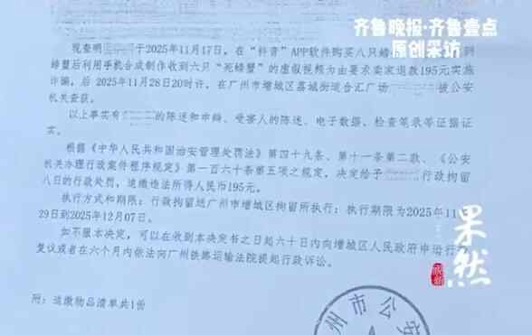 高女士展示的《广州市公安局增城区分局行政处罚决定书》显示,该当事人于2025年11月17日,购买八只螃蟹,收到螃蟹后利用手机合成制作收到六只“死螃蟹”的虚假视频,要求商家退款195元,实施诈骗。该当事人11月28日被公安机关查获。根据相关法规,决定给予该当事人行政拘留八日的行政处罚,追缴违法所得人民币195元。