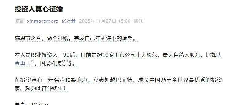 11月27日,公众号“亿万鑫”发出一篇文章《投资人真心征婚》。该文章自述称,其是90后职业投资人,是多家上市公司的十大股东之一、最大自然人股东。